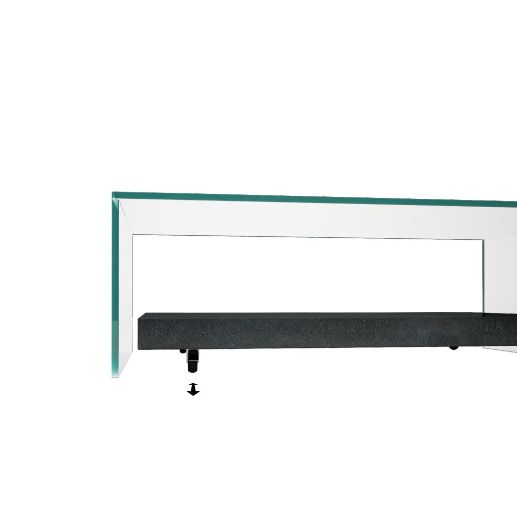 Por otro lado, la superficie de la mesa y las patas laterales están conformadas por una pieza de cristal en forma de U invertida. El cristal no solo proporciona ligereza visual al diseño, sino que también ofrece una superficie amplia y resistente para cualquier uso cotidiano.